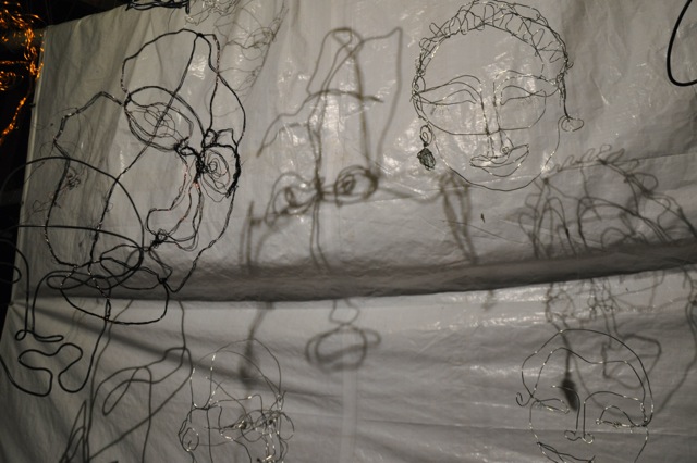 Schon beim Betreten des Gartens erlebten sie einen Gang durchs Feuer, der manche Assoziation ausgelöst haben dürfte. Möglich wurde dies durch die effektvolle Projektion eines Flammenteppichs. An anderen Stationen konnte die wärmende, anregende Kraft eines echten Feuers empfunden werden. Tropfendes, rinnendes, rauschendes, brausendes Wasser war in der riesigen Tonamphore zu hören, Licht- und Schattenspiele bannten die Besucher vor einer beleuchteten Projektionswand mit Drahtgesichtern von Renate Schwarz-Kraft, die sich im sanften Luftzug bewegten und immer neue Züge offenbarten. Dazu rezitierte der englische Schauspieler David Thomas Rilkes Gedicht „Gesichter“.